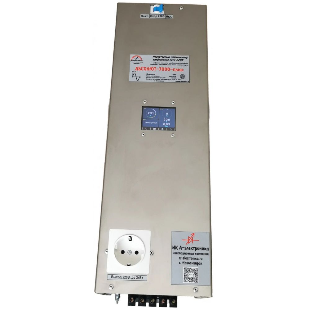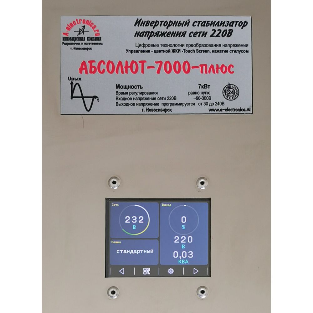 По электрическим параметрам полный аналог стабилизатора АБСОЛЮТ-7000, выпускавшегося ранее и имевшего кнопочную клавиатуру. В АБСОЛЮТ-7000-плюс применён цветной ЖКИ индикатор с экраном большего размера, с встроенным тактильным вводом информации - Touch Screen. Управление прибором происходит путём нажатия стилусом (или пальцем) на активные области индикатора, которые изображены в виде клавиш, что значительно упрощает настройку параметров, настройка происходит более привычным способом.